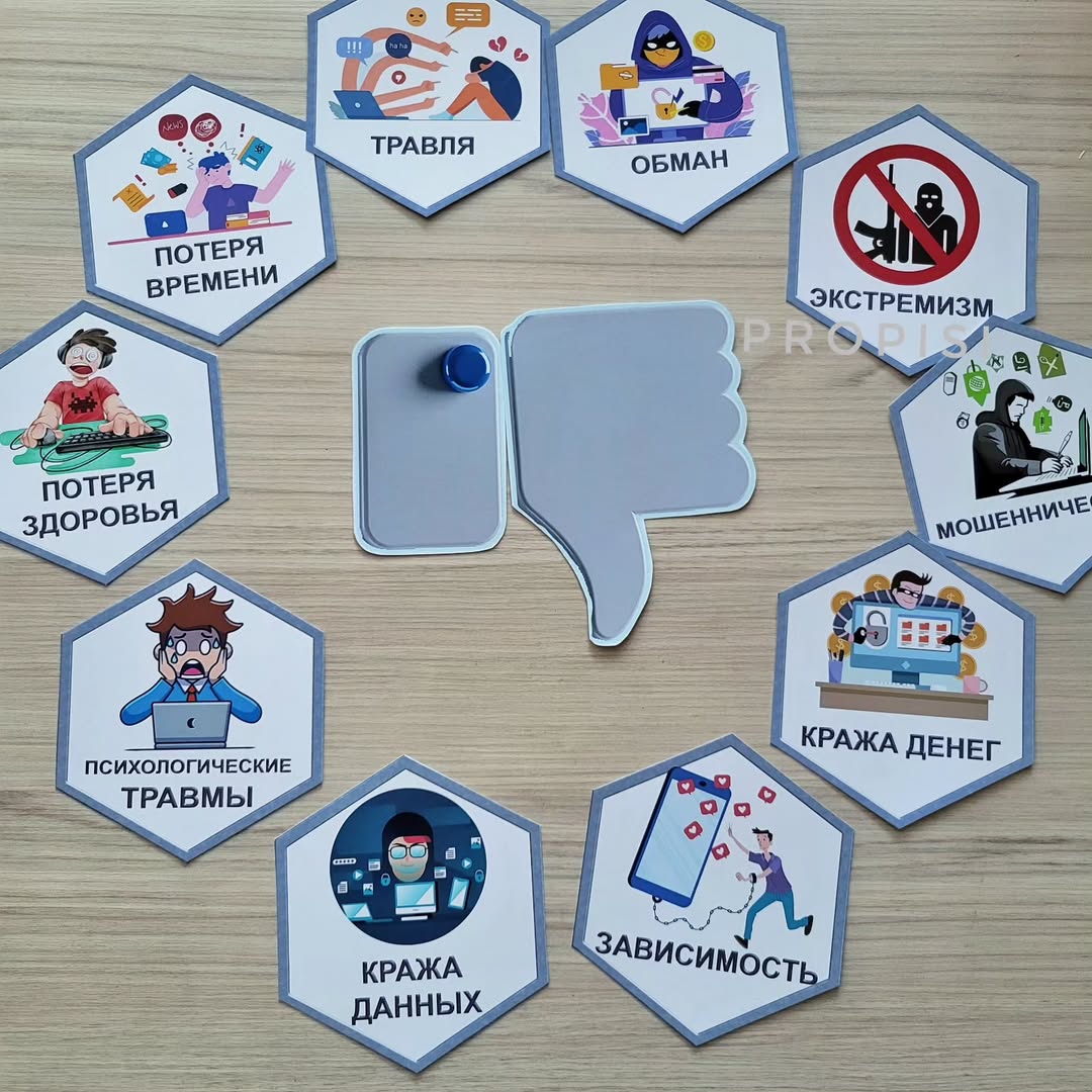 Набор для уроков безопасности "Безопасность в сети". Каталожный номер – 545 🌷 Будем пытаться донести мысль о важности личного пространства в сети и о его защите. Состав набора 24 листа А4: - центральные постеры «Два компьютера: признаки интернет-заивисмости и способы избавление от нее» , два формата печати - два постера детей, увлеченных игрой на ноутбуке - РОБОТЫ с ПРАВИЛА безопасности в сети - Игры «Флешки» - для знакомства с некоторыми понятиями в сети. - ГЕКСЫ «Положительное и отрицательное влияние Интернета». Можно использовать как игру сортировку (в наборе есть ЛАЙК и ДИЗЛАЙК), а можно для игры «найди лишнее» - составьте цепочку из положительных гексов и парочке отрицательных. Детям надо найти лишние звенья. - 12 ДЖОЙСТИКОВ с вопросами для беседы об Интрнете и его значении в жизни детей. 💰 В электронном виде (pdf, не редактируется)